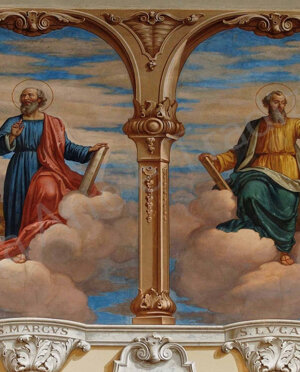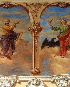 Sono stati dipinti in origine dal pittore Giuseppe Masoero nel 1864 durante la decorazione della chiesa, fino ad allora semplicemente intonacata. Rappresentano San Matteo e San Giovanni, sul lato sinistro del presbiterio, e San Marco e San Luca, sul lato opposto. In seguito a infiltrazioni d’acqua che li hanno danneggiati sono stati ridipinti nel 1933, quando era parroco Don Raiteri, dal pittore granese Anacleto Laretto.