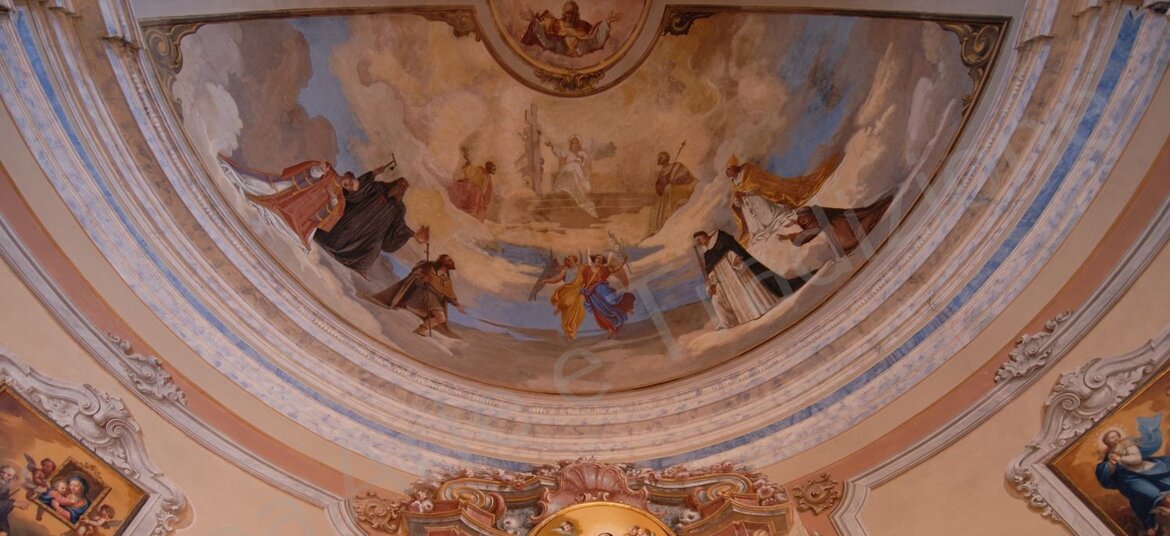 È opera del pittore Giuseppe Masoero e raffigura il percorso devozionale del paese di Grana. L’insieme è su tre piani digradanti arricchiti da nuvole volte a dare un certo senso di tridimensionalità. Nella parte più alta, racchiuso in un semicerchio, è raffigurato Dio Padre, mentre subito al disotto, nella parte centrale troviamo Gesù Cristo che indica la croce e alla sua destra Pietro e alla sua sinistra Paolo, i pilastri della Chiesa. Nella parte inferiore, al centro, due angeli di fattezze femminili che portano rami di palma e gigli. Alla destra degli angeli, partendo dall’esterno, troviamo Santo Stefano, a cui è intitolata una piccola cappella votiva all’ingresso del paese, provenendo da Calliano, all’inizio di corso Garibaldi un tempo nota come via Santo Stefano. Con il saio scuro è raffigurato San Rocco, a cui è dedicata la chiesetta ai margini sud del paese, chiesetta che durante l’epidemia di peste del 1630 (quella descritta da Alessandro Manzoni nei Promessi Sposi) fu utilizzata come lazzaretto. Giova ricordare che il santo è anche protettore contro le malattie contagiose. Accanto a lui, inginocchiato, troviamo Sant’Antonio Abate, fondatore in Italia del monachesimo. A lui è dedicata la chiesetta posta i piedi della salita di via Roma, come risulta dai verbali di più visite pastorali del passato, anche se al suo interno è presente una statua di Sant’Antonio da Padova. Nell’altro gruppo di santi sono raffigurati, partendo dal centro, San Pietro Martire, frate domenicano inquisitore contro gli eretici a cui era dedicata una chiesetta che si trovava nei pressi del ristorante Roma, abbattuta negli anni ’70. Il santo con il saio scuro è San Bernardino, mentre sopra di loro è raffigurato San Silverio papa, a cui è dedicato un pilone votivo in aperta campagna, all’ingresso del paese giungendo da Calliano. I morti di peste durante l’epidemia del 1630 non venivano sepolti in paese per paura del contagio, ma erano seppelliti intorno a questa cappelletta.