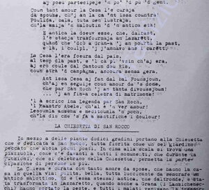 La Chiesa di San Rocco, una delle 3000 presenti in tutta Italia dedicate al santo, non ha particolari pretese artistiche, seppure si presenti con gradevoli linee architettoniche, e all’interno il Santo è raffigurato con una statua in gesso ancorata alla nicchia posta sull’altare. Una particolarità di questa statua, voluta da Don Mazzolia, della quale si trova traccia nei documenti storici già dai primi del 1600, è rappresentata col cane a fianco che ha in bocca la tipica forma di pane monferrina, la “grissia” e questo fa pensare che l’autore, seppure ignoto, fosse della zona.
