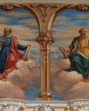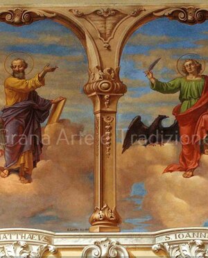A proposito di questi quattro affreschi va rimarcato come anche in questo caso, e come ben narrato nelle diverse pagine della storia della Chiesa Parrocchiale (vedi qui), sia intervenuta la generosità degli abitanti: infatti, il dipinto di S. Luca è stato offerto dal rag. Pietro Dessimone, l'immagine di S. Marco è stata resa possibile da una donazione della famiglia del Comm. Garrone, l'affresco di S. Matteo ha visto il contributo di Pietro Arrobbio e quello di S. Giovanni è stato frutto di una donazione del cav. Giuseppe Arrobbio. Donazioni rese ben visibili su ogni affresco.