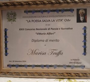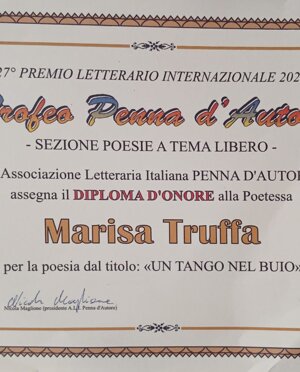 L’ultima fatica di Marisa Truffa, una poesia dedicata ad una signora non vedente, dal titolo “Tango nel buio”, ha ricevuto nel dicembre 2024, nell’ambito del 27° Premio Internazionale Letterario un Diploma d’onore dall’Associazione Letteraria Italiana “Penna d’Autore”. La poesia è stata altresì inserita nella speciale Antologia riservata alle opere migliori.